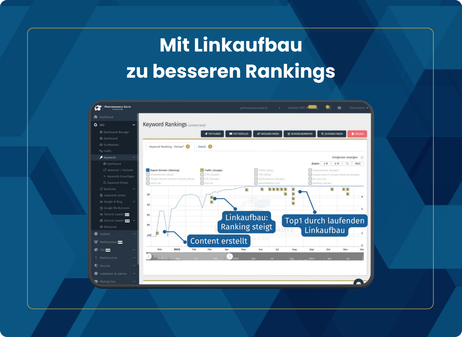 Mit der Performance Suite kannst du ganz einfach potenzielle Webseiten für Backlinks finden. Das Tool bietet dir umfassende Keyword- und Wettbewerbsanalysen, die dir dabei helfen, neue Backlink-Möglichkeiten zu entdecken. Dazu gehört unter anderem der Aufbau hochwertiger Content-Links oder die Nutzung von Masselinks über Branchenverzeichnisse, Blogkommentare und ähnliche Quellen.