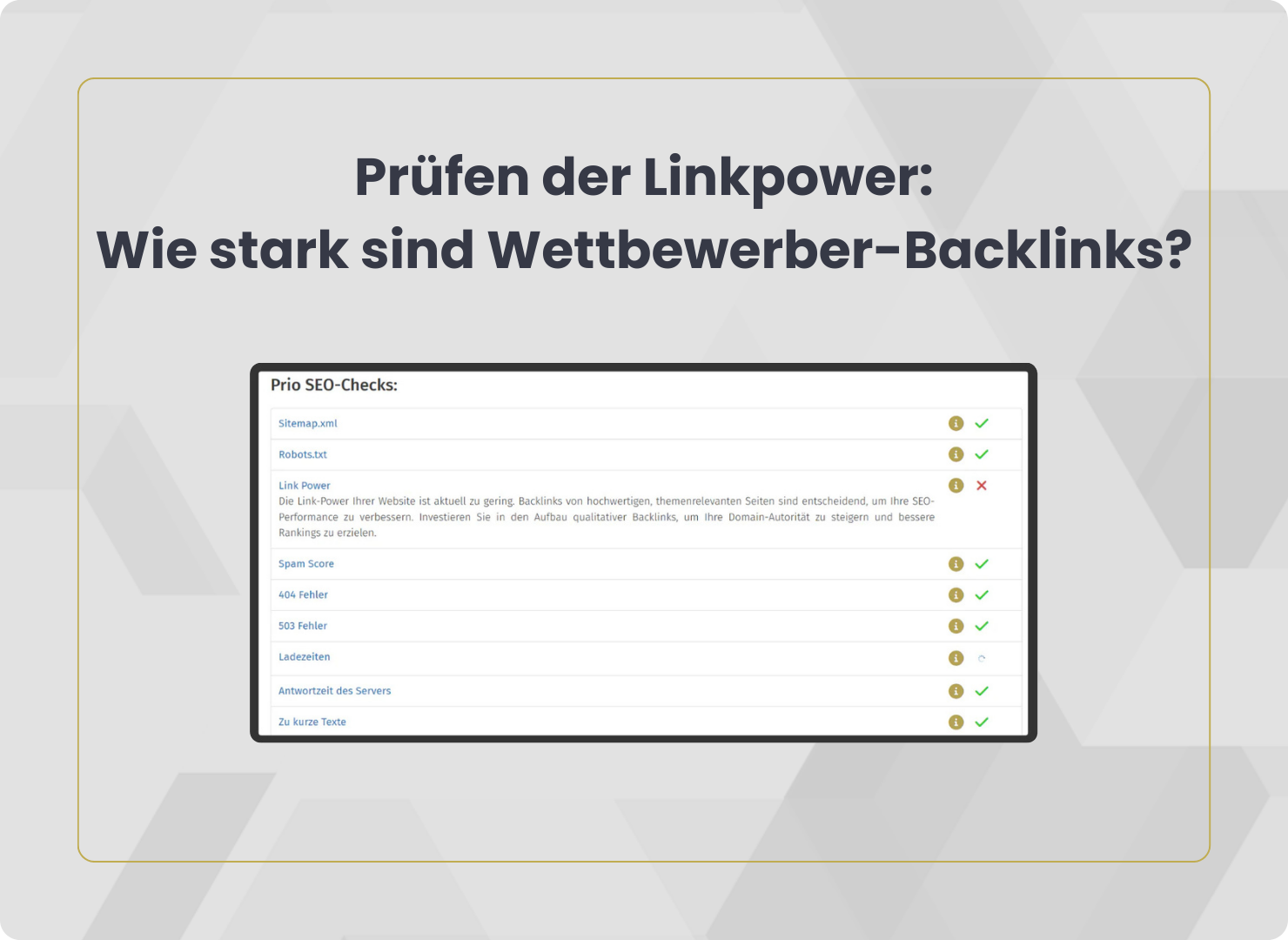 Linkpower beschreibt die Stärke oder Autorität, die eine Webseite durch eingehende Links von anderen Seiten erhält. Unsere Tests zeigen: Je höher die Linkpower eines Wettbewerbers, desto leichter ranken dessen neue Inhalte.