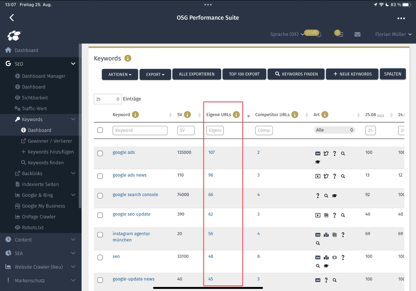 Im Keyword-Dashboard kannst du für jedes Keyword einsehen, wie oft ein URL-Wechsel vorkam. Falls ein Keyword in letzter Zeit mit verschiedenen Seiten deiner Domain gerankt hat, solltest du genauer hinschauen. Nicht jeder URL-Wechsel bedeutet sofort eine kritische Kannibalisierung – aber er ist ein Warnsignal, dem du nachgehen solltest.