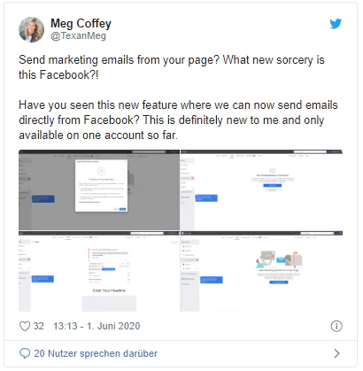 Es deutet einiges darauf hin, dass baldE-Mail-Kampagnen über die Seitenmanager-App von Facebook verschickt werden können. Einige User haben sogar jetzt schon die Möglichkeit diese neue Funktion zu nutzen. Die Marketing-E-Mails können dann an zuvor eingepflegte Kontakte verschickt werden. Die Social-Media-Expertin Meg Coffey teilte hierzu in Twitter diese Screenshots: