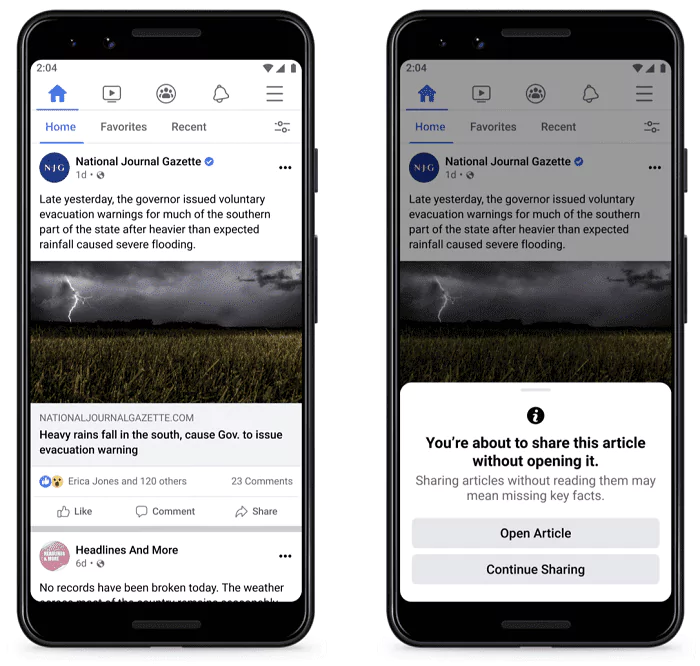 “Starting today, we’re testing a way to promote more informed sharing of news articles. If you go to share a news article link you haven’t opened, we’ll show a prompt encouraging you to open it and read it, before sharing it with others.”