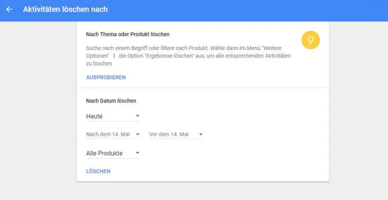 Um die eigenen Daten einzusehen, müssen sich Nutzer lediglich in der “My Activity” Seite einloggen. Sobald man eingeloggt ist, geht es mit einem Klick auf das Dreipunkt-Menü rechts oben weiter. Hier einfach auf “Aktivitäten löschen nach” bzw. “Delete activity by” klicken. Google führt seine Nutzer dann in ein neues Menü, welches unterschiedlichste Möglichkeiten bietet, um die eigenen Daten zu löschen, beispielsweise nach Keyword, Produkt oder Zeitspanne: