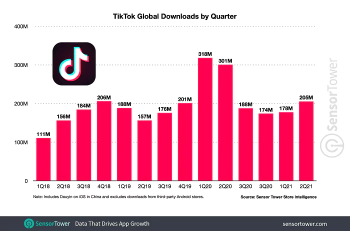 “In Q2 2021, TikTok saw its greatest quarter-over-quarter growth in consumer spending since Q2 2020, climbing 39 percent to $534.6 million from $384.7 million in the previous quarter. TikTok’s adoption has also accelerated in 2021, as first-time downloads climbed 2 percent Q/Q to 177.5 million in Q1 2021, and surged 16 percent Q/Q to 205.4 million Q2 2021, the most growth the app has seen since its record-breaking Q1 2020 when it accumulated more than 315 million installs, the most any app has seen in a single quarter.”