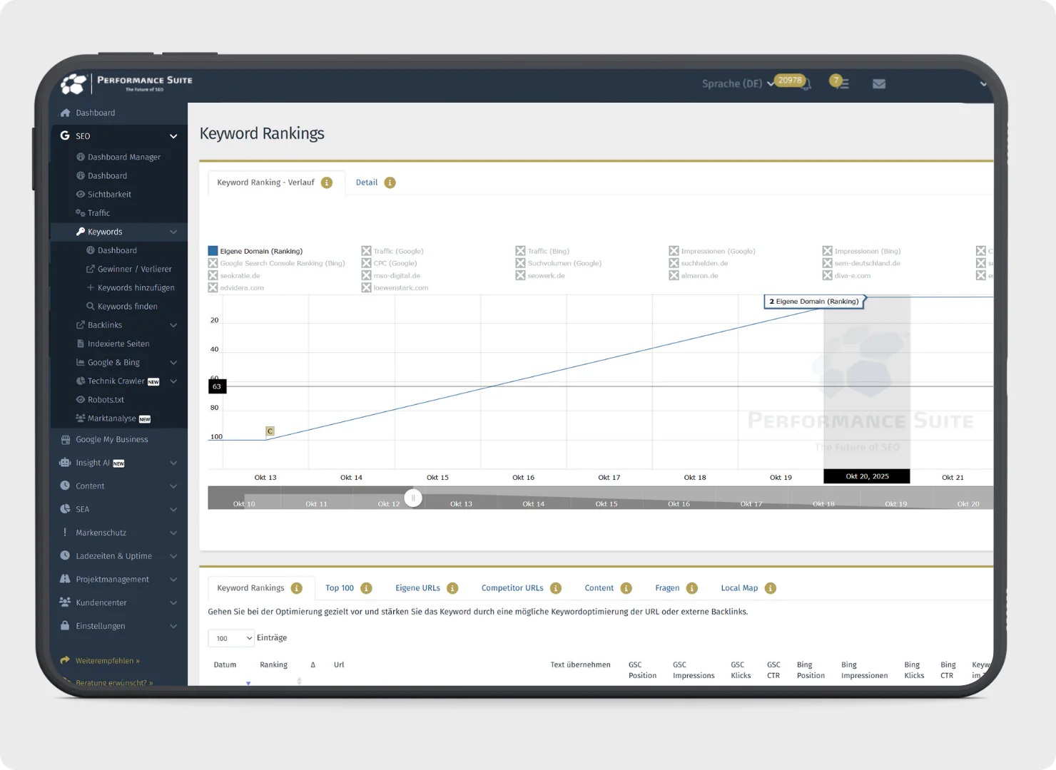 Die Rankings wurden mithilfe der firmeneigenen Performance Suite gemessen. Viele SEO-Tools und auch die Google Search Console zeigen nur Ergebnisse in den Top 10 oder Top 20 an und liefern lediglich Durchschnittspositionen. Für ein Projekt mit hunderten Standorten ist das unzureichend. Die Performance Suite dagegen erfasst standortgenau alle Positionen bis Platz 100, sodass früh erkennbar ist, welche Städte gut performen, wo Potenzial besteht und welche Prompts nachgeschärft werden müssen. Interessierte können einen kostenlosen Account anlegen und das Tracking selbst testen.