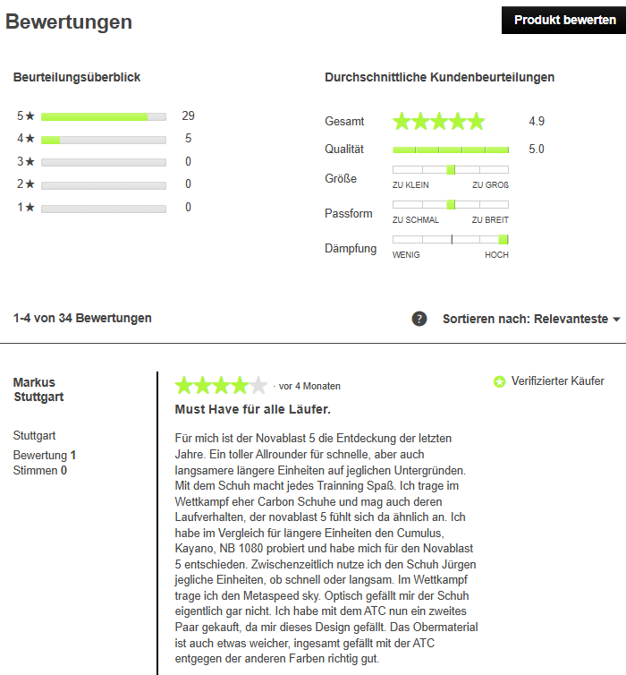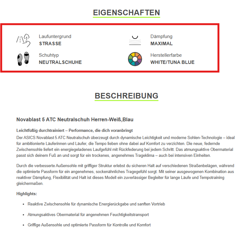 Bei bekannten Marken lohnt es sich, Markengeschichte oder Besonderheiten kurz einfließen zu lassen. Die Running-Point-Seite zeigt das Modell „Asics Novablast 5 ATC“ mit einer Übersicht zu Laufuntergrund, Dämpfung und Schuhtyp – so wissen die Nutzer sofort, ob der Schuh zu ihnen passt. Bei No-Name-Produkten ist die Marke weniger entscheidend; fokussiere dann stärker auf Nutzen und Qualitätsmerkmale.