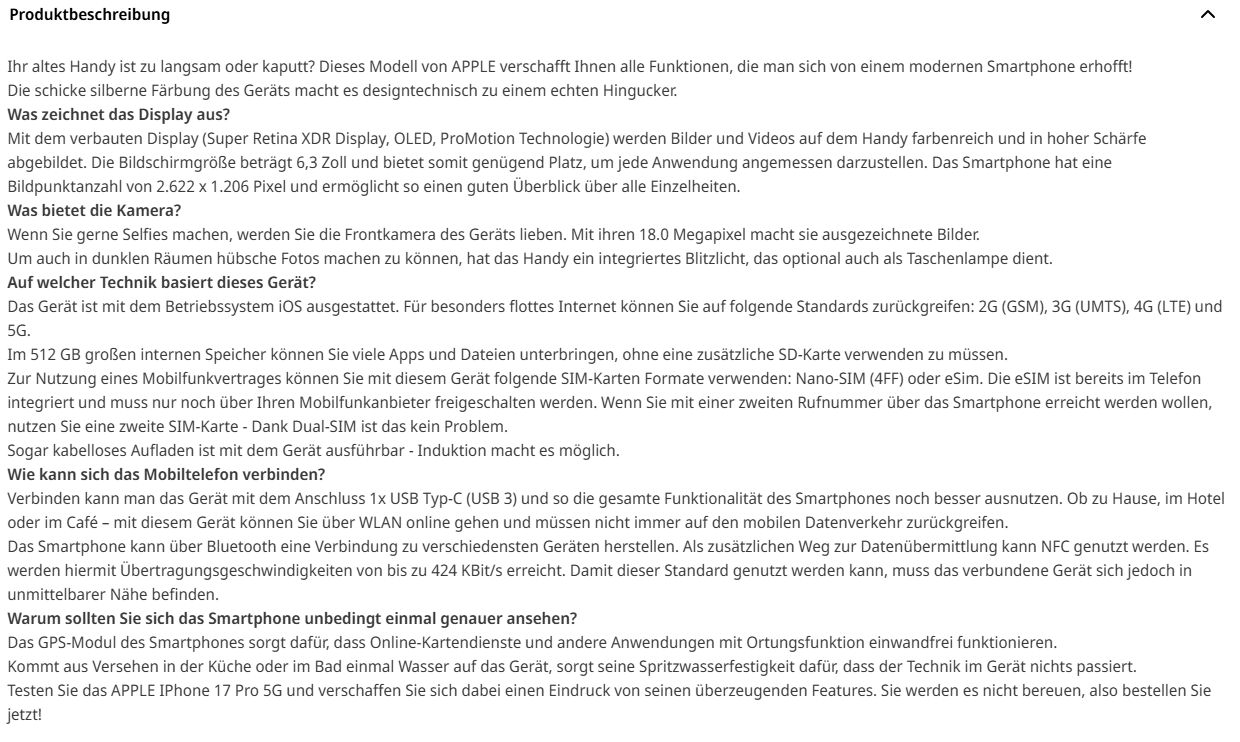 Lange, unstrukturierte Textblöcke schrecken ab. MediaMarkt macht es vor: Beim iPhone-17-Pro-Produkttext verschwinden die Informationen in einem Textblock ohne Gliederung. Besucher haben keinen Überblick über die Funktionen und springen ab. Sorge stattdessen für Abschnitte mit klaren Überschriften, kurze Sätze und passende Bilder.