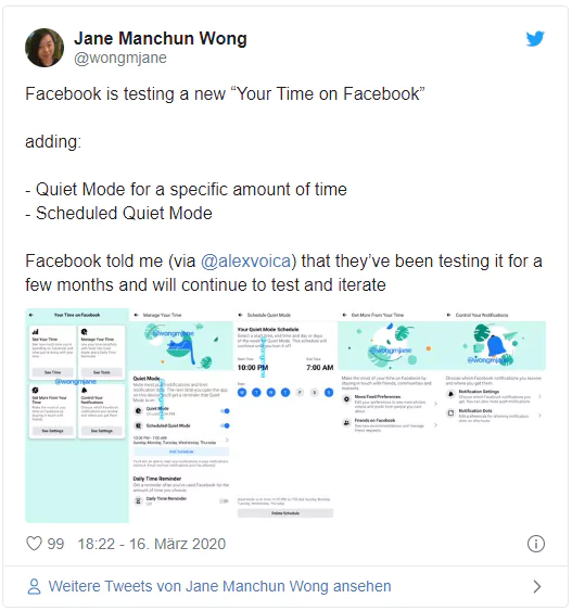 Facebook will Usern beim sogenannten Digital Detox helfen. Dafür testet Facebook gerade zwei neue Features: Quiet Mode und Scheduled Quiet Mode. Jane Manchun Wong hat diese neuen Erweiterungen entdeckt und teilte dies auf Twitter: