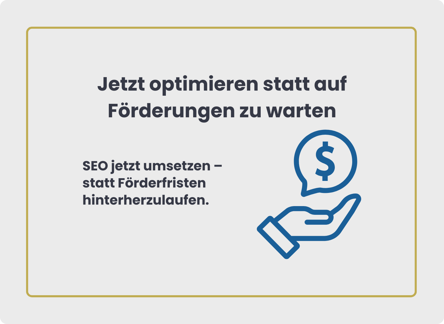 Wenn du schnell Ergebnisse brauchst (Relaunch, Traffic-Einbruch, neue Zielmärkte), ist ein sofortiger Start oft sinnvoller als Wochen mit Anträgen zu verbringen. Vorgehen: Quick-Wins (Technik, Content, interne Verlinkung), parallel nachhaltige Maßnahmen. Förderungen können später für Erweiterungen genutzt werden.