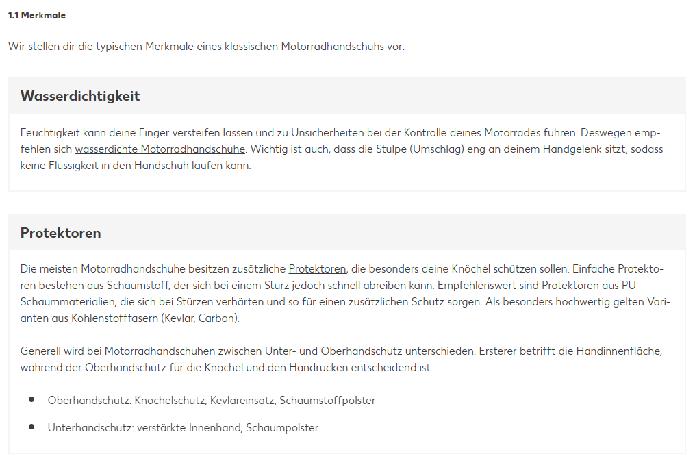 Kaufland zeigt bei seinen Motorradhandschuhen, wie sich komplexe Informationen übersichtlich aufbereiten lassen. Die Seite listet die wichtigsten Sicherheitsmerkmale (Schutz vor Abrieb, Knöchelschutz, Wasserdichtheit) in Bulletpoints auf und erklärt im nächsten Abschnitt, wie die richtige Passform ermittelt wird. Eine Tabelle hilft dabei, die passende Größe anhand des Handumfangs zu bestimmen. Dieses Prinzip lässt sich auch auf Kleidungsstücke, Elektronik oder Möbel übertragen: Sicherheit, Komfort und Pflegehinweise als Listen, ergänzt durch Größentabellen oder technische Daten.