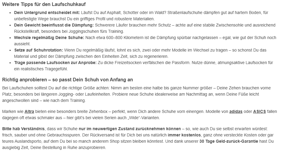 Ein gelungener Kategorietext kombiniert klare Struktur mit hilfreichen Informationen. Kaufland und Running Point nutzen dies vorbildlich: Beide Seiten gliedern ihre Texte in kurze Abschnitte, nutzen Überschriften zur Orientierung, lockern lange Passagen mit Listen oder Tabellen auf und bieten Kaufberatung. Diese Methoden lassen sich auf jede Branche übertragen – von Elektronik über Mode bis hin zu DIY-Material.
