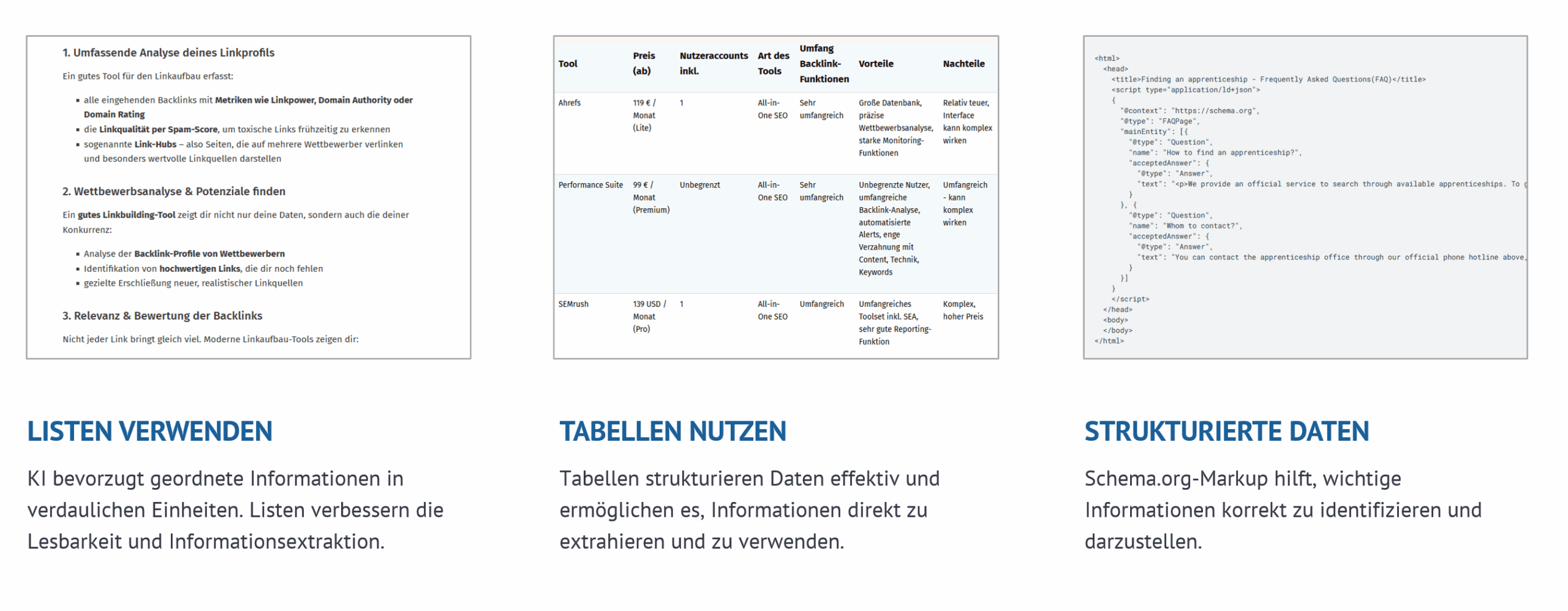 Beispiele für Listen, Tabellen und Strukturierte Daten.