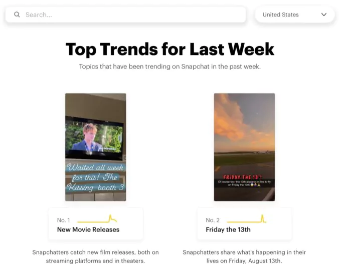 Snapchat Trends ist Google Trends insofern sehr ähnlich, als es einen allgemeinen Überblick über die Beliebtheit eines Keywords auf Snapchat gibt. Auch die Homepages ähneln sich sehr. Auf der Startseite von Snapchat Trends erscheint eine Suchleiste, gefolgt von einer Liste der Top-Trends der letzten Woche.