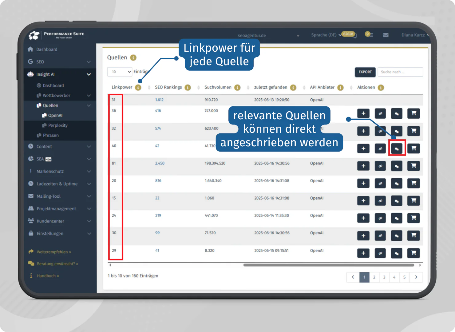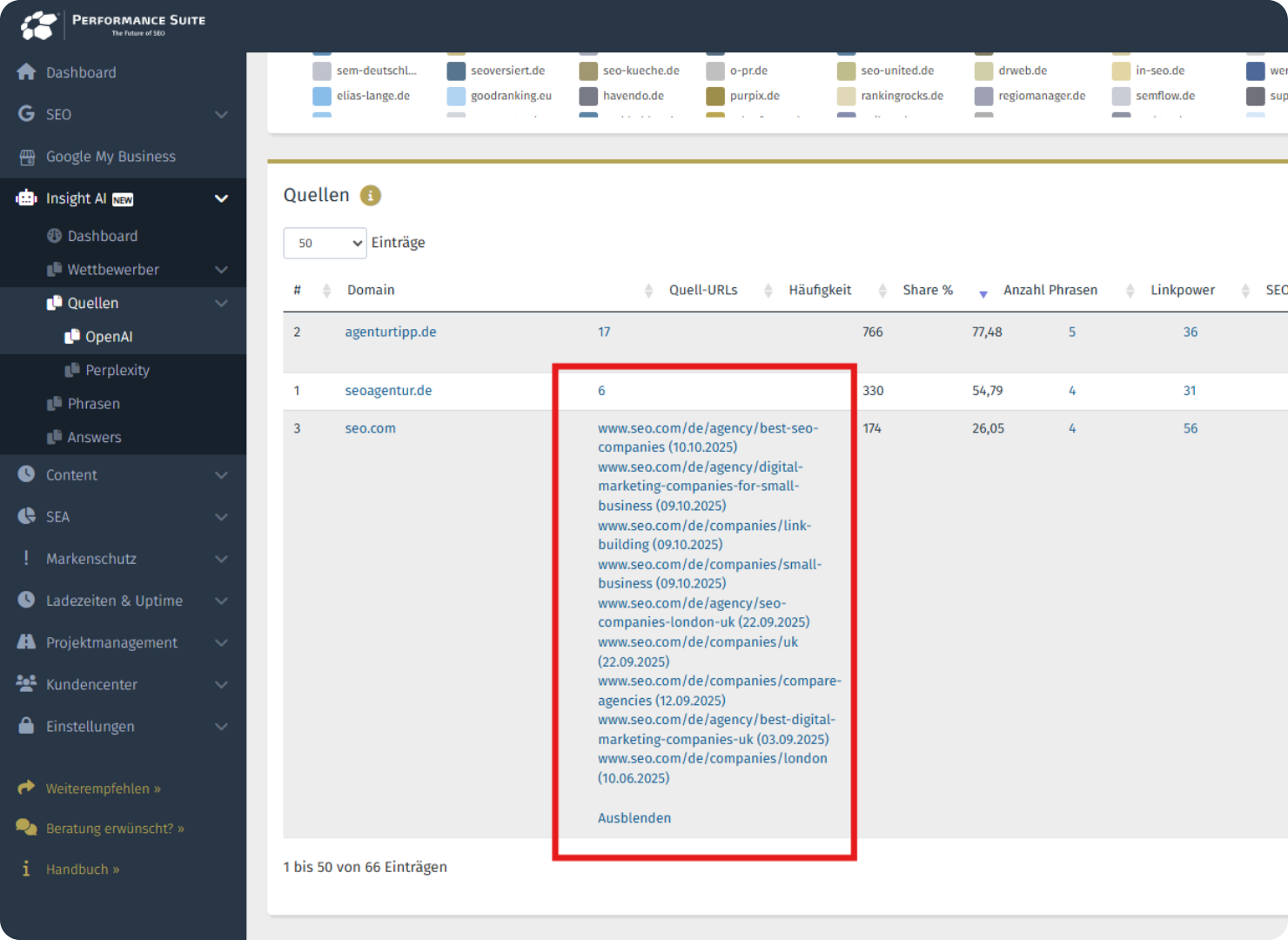 Die Quellen sind nach Priorität und SEO-Kennzahlen (z. B. Linkpower) geordnet, sodass du sofort siehst, welche Seiten die höchste Autorität und Sichtbarkeit besitzen. Darauf aufbauend kannst du deine Linkbuilding-Strategie gezielt ausrichten, ähnliche Quellen ansteuern und so die Chance erhöhen, von KI-Systemen als vertrauenswürdige Referenz erkannt zu werden.