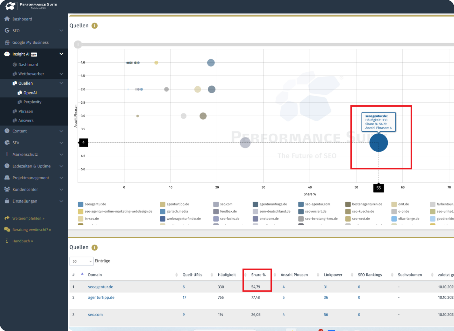 Zunächst definierst du in der Performance Suite einen Fragenkatalog mit relevanten Suchprompts – sehr ähnlich zu dem zuvor erwähnten Prozess. Dann führt das Tool täglich automatisierte Abfragen bei ChatGPT und Co. durch und sammelt die Antworten. Bereits ab dem ersten Tag erhältst du handfeste Daten, welche Unternehmen oder Webseiten in den Antworten genannt werden und wie häufig.