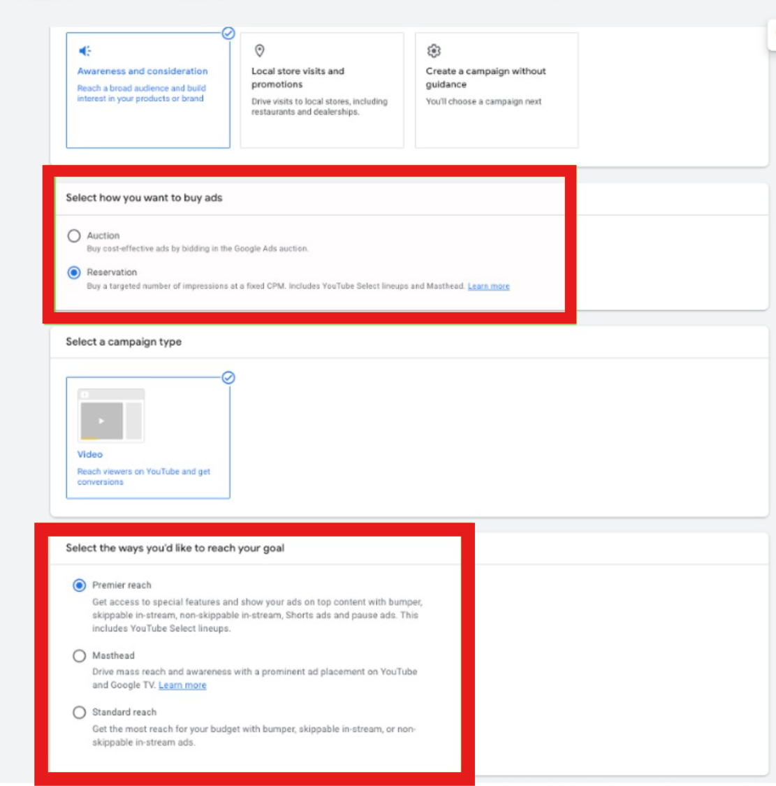 - Auswahl des Kampagnentyps (Premier Reach, Masthead, Standard Reach)